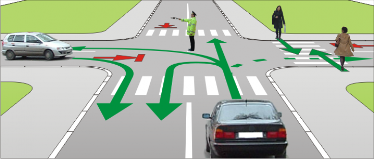 pentru pietoni – "circulaţia permisă" pe trecerile din faţa şi din spatele agentului de circulaţie.