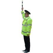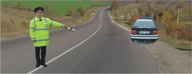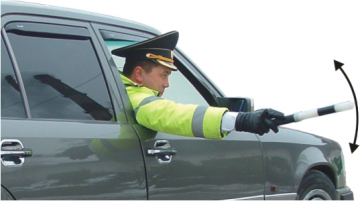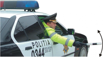 3) În cazul în care agentul de circulaţie se află în misiuni de serviciu de urgenţă, deplasîndu-se într-un vehicul de ocazie, acesta va executa semnale privind oprirea altor vehicule prin balansarea bastonului de semnalizare ori a braţului întins orizontal, scos afară prin geamul deschis al portierei, sau va impune oprirea prin intermediul megafonului (figura 22).