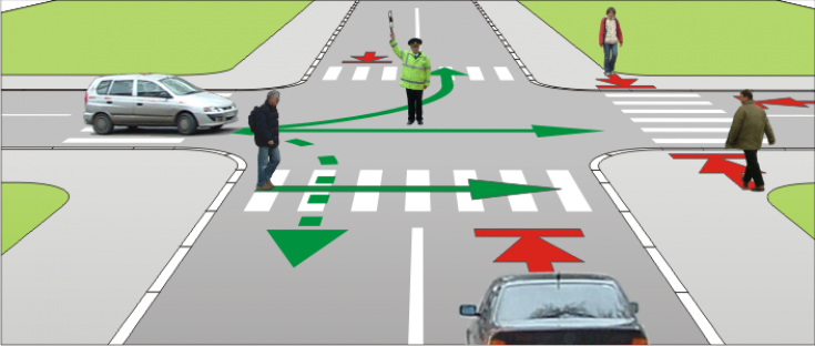 pentru pietoni – "circulaţia permisă" pe trecerile din faţa şi din spatele agentului de circulaţie.